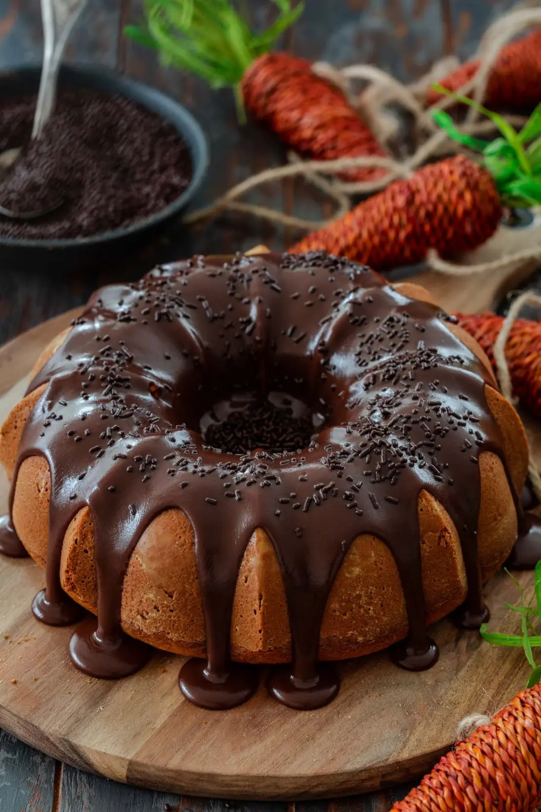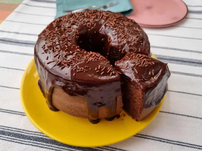 A moist, golden Brazilian carrot cake topped with a rich, glossy chocolate glaze—smooth, sweet, and perfect with coffee.